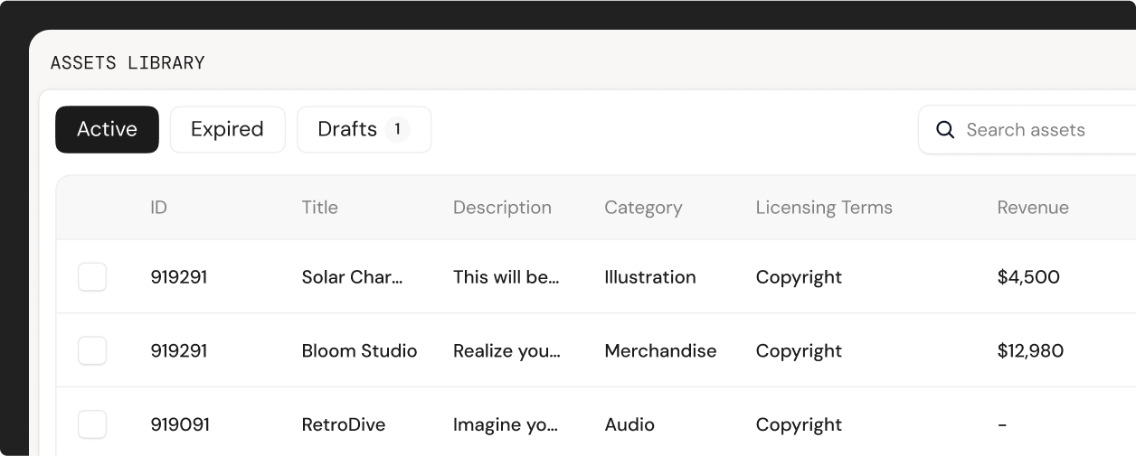 You can upload or link an asset directly from your dashboard, then tag rights, ownership, and distribution rules in one guided flow. The asset becomes instantly available for deals, usage tracking, and license requests.
